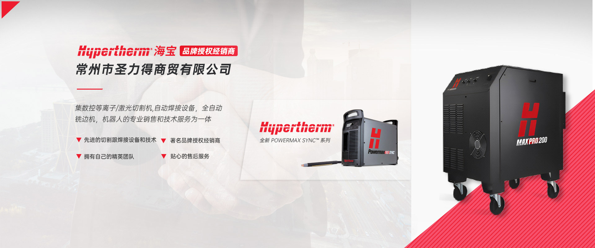 常州市圣力得商贸有限公司是一家集数控等离子/激光切割机,自动焊接设备,全自动铣边机,机器人的专业销售和技术服务为一体的公司。本公司是世界品牌Hypertherm(美国海宝)公司的授权经销商。  公司是一支技术稳定、服务优良、富有朝气的精英团队。公司致力于将国外先进的切割跟焊接设备和技术介绍给中国的机器制造商和终端用户,并为用户提供品质的产品和完善的售后服务。  公司主要代理以下产品:  1.美国海宝Hypertherm等离子机用电源,手持电源,原装易损件及备件  2.韩国赛拉科(CERACO)铣边机,南京顶瑞自动焊接小车  3.迈誓坦(MicroStep),日本田中(TANAKA),武汉法利莱(FARLEY-LASERLAB),江苏博大品牌等离子切割机,激光切割机及维修配件。  4.美国海宝,美国飞马特,凯尔贝等原装正品易损件及配件  5.激光切割机,等离子切割机,火焰切割机升级,安装与调试及技术升级改造项目  6.机器人焊/切生产线  热忱欢迎广大用户前来询价及洽谈。